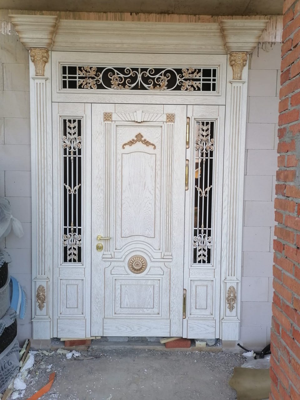 Дополняют композицию колонны с капителями и золотистые накладки — они придают двери архитектурную выразительность и напоминают о дворцовых входах эпохи барокко.